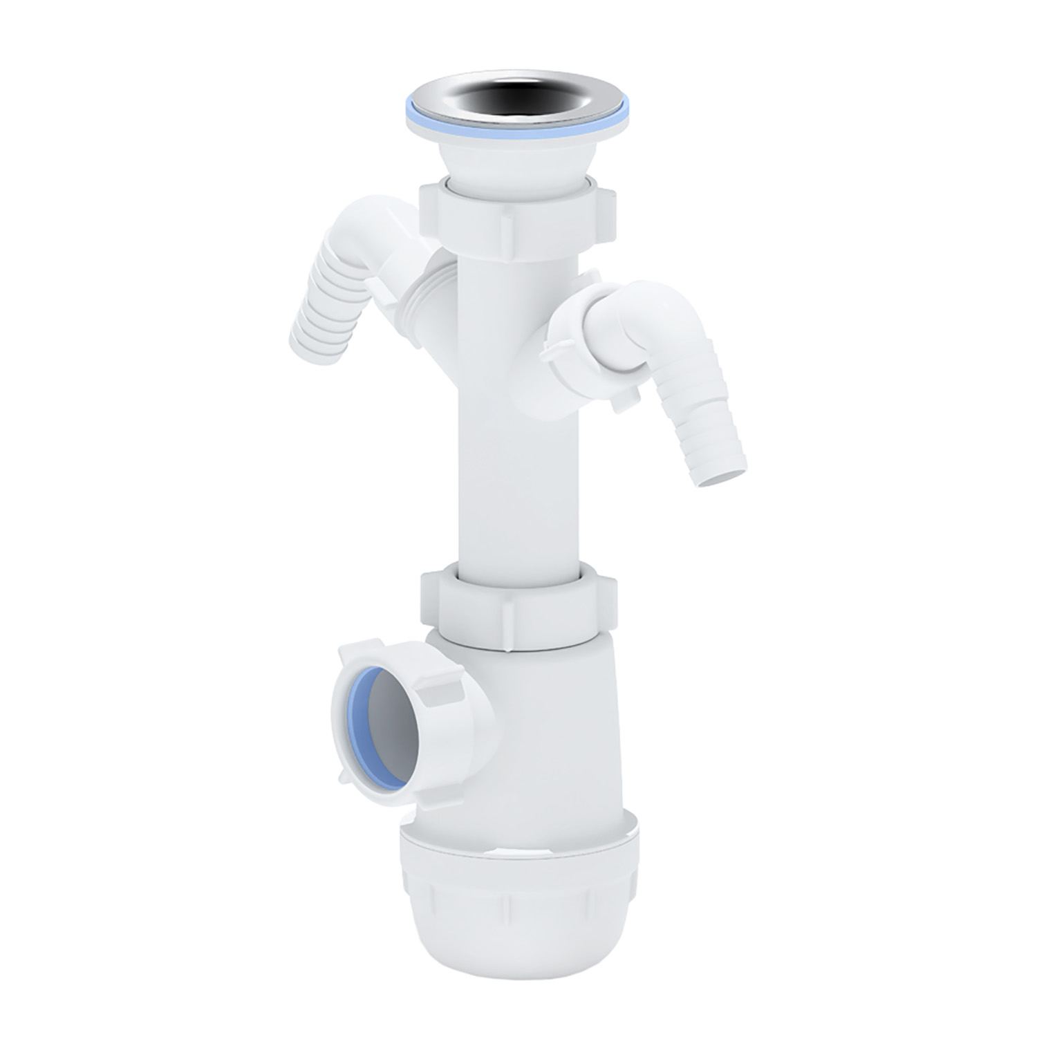 Сифон для кухонных моек с диаметром сливного отверстия 50мм, бутылочного типа с увеличенным корпусом. С разборным выпуском и нержавеющей решеткой, с двумя отводами для подключения бытовой техники.