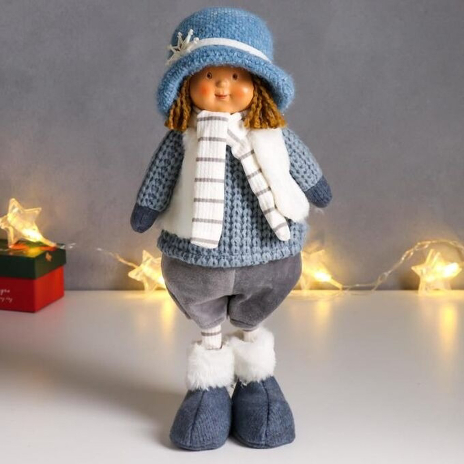 яяяКукла интерьерная "Малыш в вязаном синем наряде и шляпке со снежинкой" 36,5 см 6260113