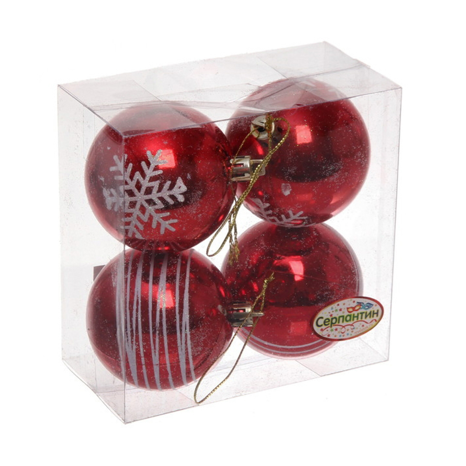 Новогодние шары 6 см (набор 4 шт) "Снежные нити", красный/белый