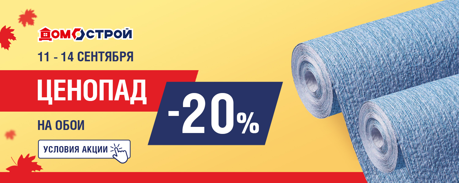 Осень — это пора ЦЕНОПАДа в ДомоСтрой! Готовите ремонт или мечтаете освежить интерьер? С 11 по 14 сентября вас ждёт скидка 20% на обои. Выбирайте стиль, экспериментируйте с дизайном и создавайте атмосферу, в которой будет приятно жить.